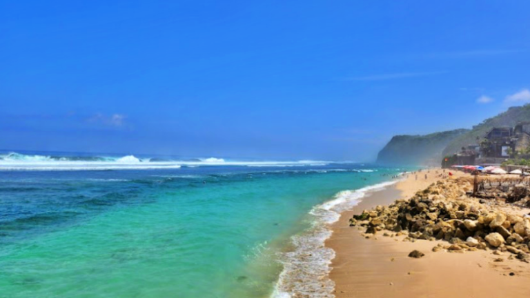 Pantai Bukit Berahu di Bali menawarkan keindahan alam yang memukau, pasir putih bersih, dan pemandangan laut yang menenangkan, cocok untuk bersantai dan menikmati alam.