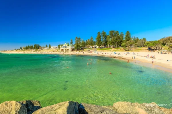 Pantai Cottesloe Beach di Perth menawarkan pasir putih bersih dan pemandangan matahari terbenam yang menakjubkan, cocok untuk bersantai dan menikmati keindahan alam Australia.