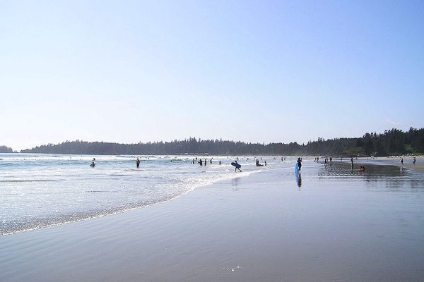 Pantai Long Beach di Tofino, British Columbia, menawarkan pemandangan pantai yang memukau, pasir lembut, dan suasana tenang, ideal untuk bersantai dan menikmati keindahan alam.