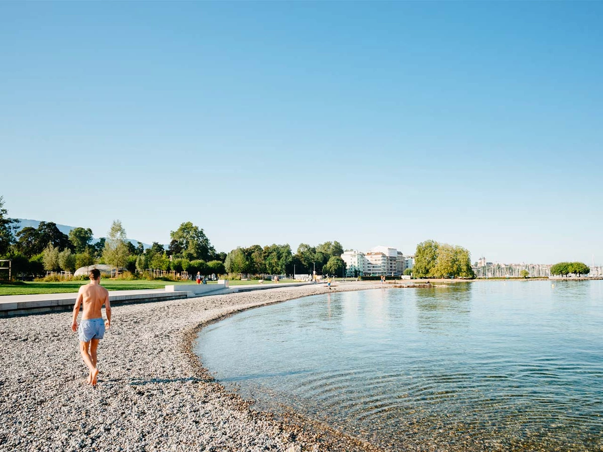 Selain dari segi akses, lokasi ini juga memiliki keunggulan dari segi pemandangan. Dengan latar belakang pegunungan dan kota Geneva yang modern, pantai ini menawarkan kombinasi keindahan alam dan kehidupan urban yang harmonis. Pemandangan matahari terbenam di cakrawala danau dari pantai ini sangat menawan dan menjadi daya tarik utama bagi para fotografer maupun pasangan yang mencari suasana romantis. Keberadaannya di pinggir danau juga memungkinkan pengunjung untuk melakukan berbagai aktivitas air, seperti berperahu atau sekadar menikmati suasana di atas perahu kecil.